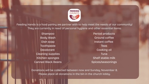 Stonecrest Community Church is partnering with Feeding Hands Food Pantry to serve individuals and families in our region who are experiencing food insecurity.